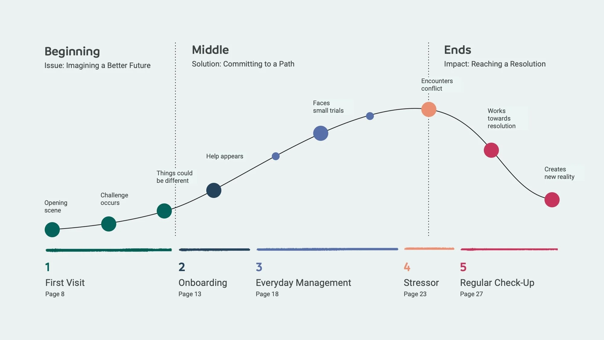Following a traditional narrative arch, we developed a short story to express product experience benefits and the journey of a person managing their diabetes to be shared across teams.